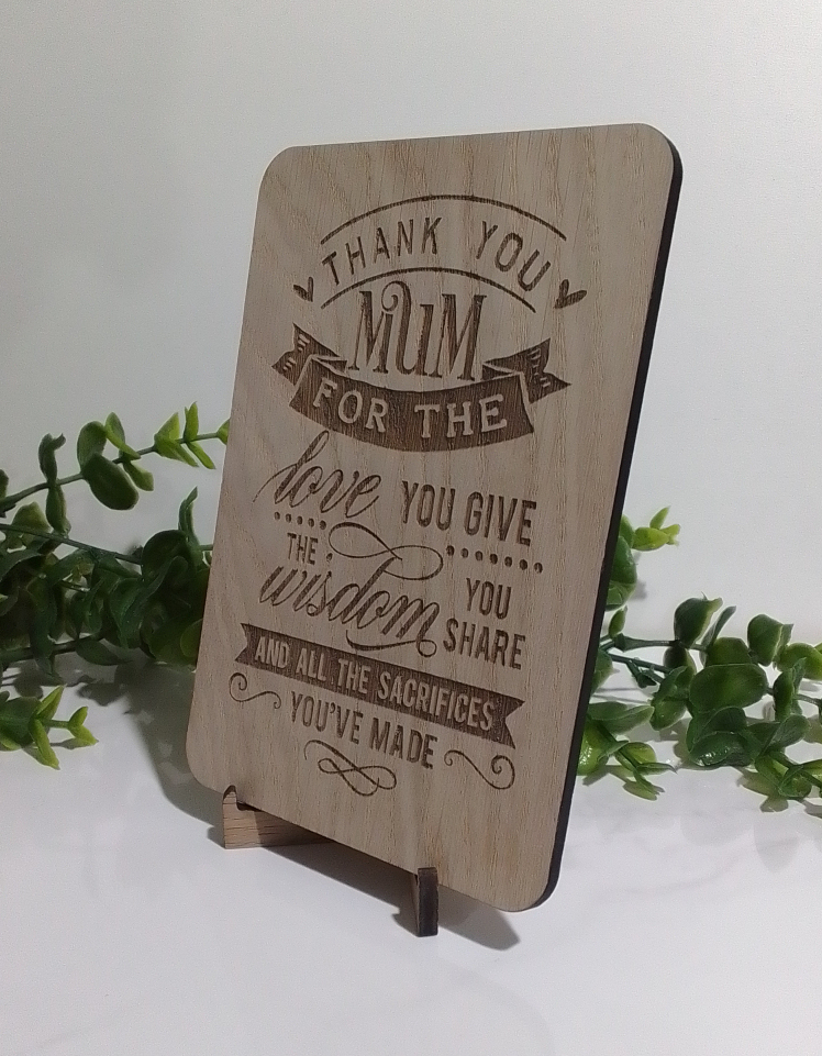 Wooden gift card with a special thank you for mum.   Give something special, something different for an occasion …   Instead of that usual paper card, why not gift something unique, one of our engraved wooden gift cards and make your gift stand out !