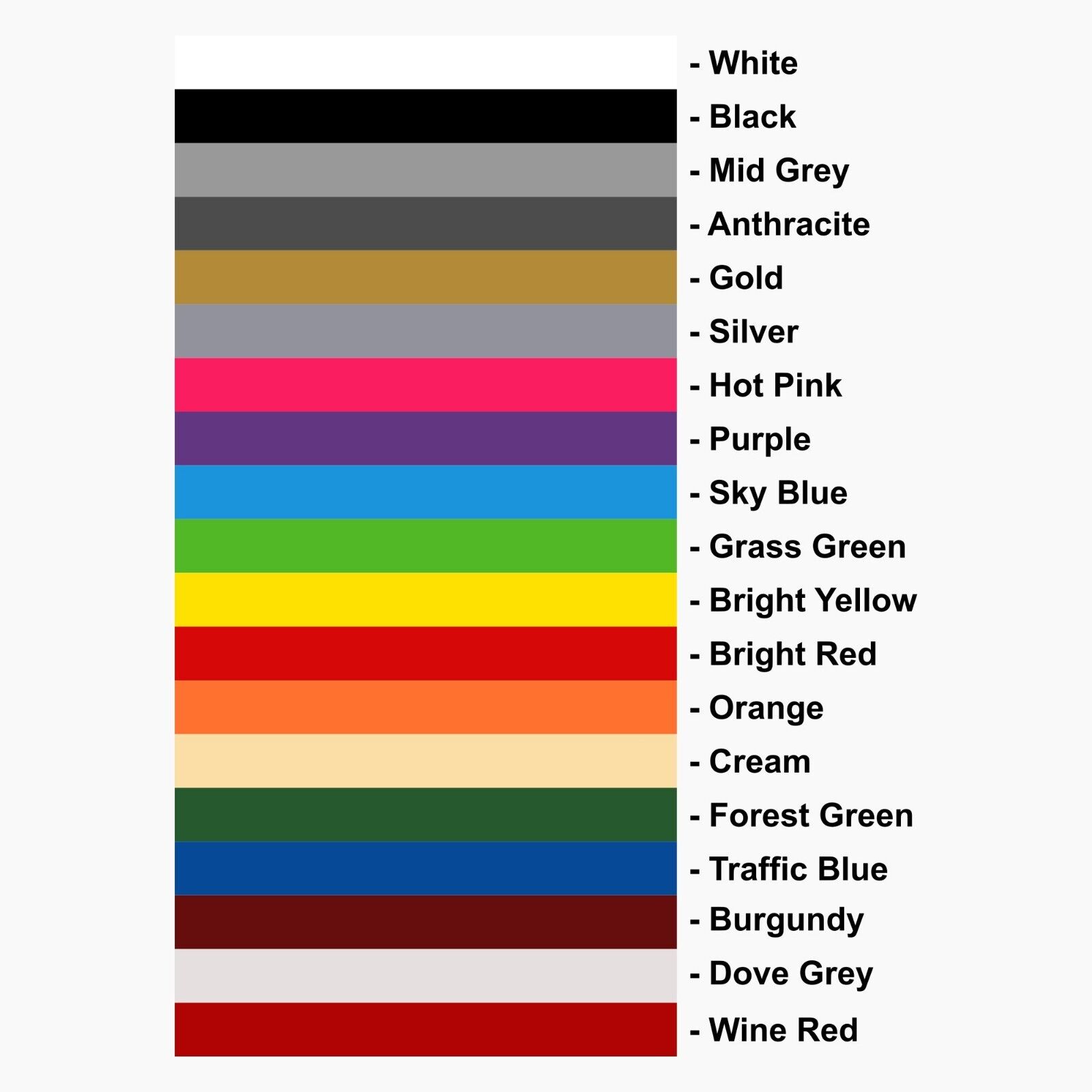 Black, White, Mid Grey, Anthracite, Gold, Silver, Hot Pink, Purple, Sky Blue, Green, Bright Yellow, Bright Red, Orange, Cream, Forest Green, Traffic Blue, Burgundy, Dove Grey, Wine Red